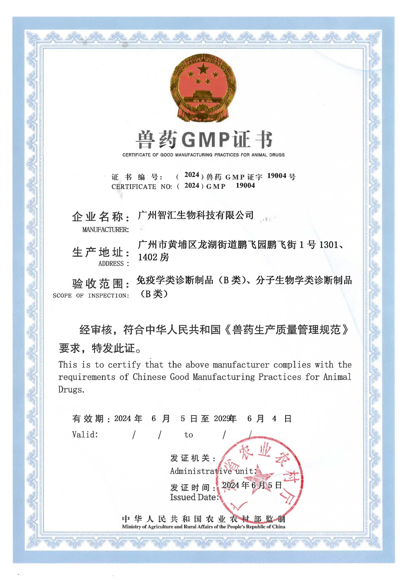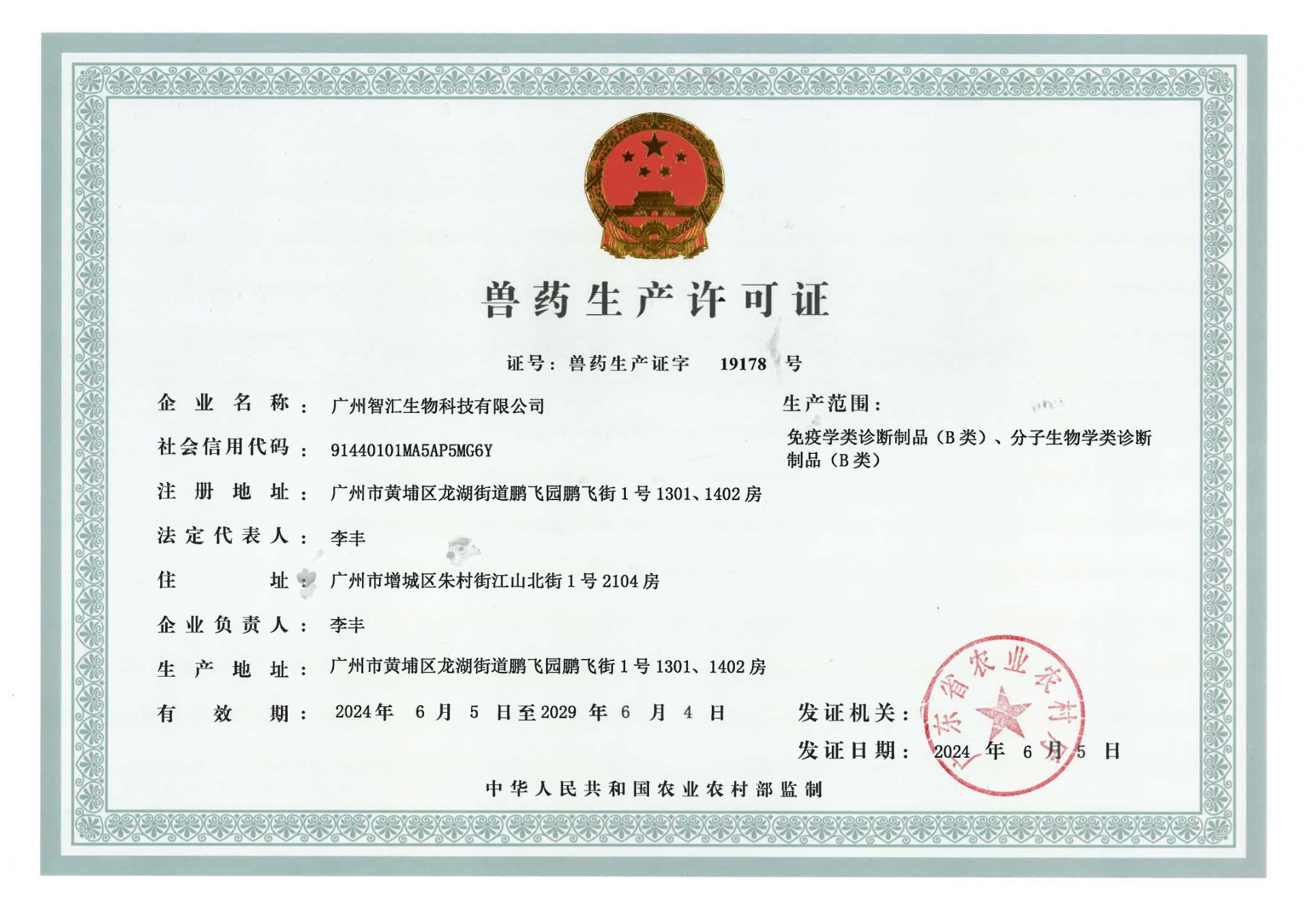 2024年4月,廣東省農(nóng)業(yè)農(nóng)村廳專家組成員對我司獸藥GMP、獸藥生產(chǎn)許可進(jìn)行檢查驗收工作。專家組全面細(xì)致的檢查與考核,一致認(rèn)為廣州智匯生物科技有限公司符合《獸藥生產(chǎn)質(zhì)量管理規(guī)范》標(biāo)準(zhǔn)要求,符合獸藥診斷制品GMP合格生產(chǎn)線標(biāo)準(zhǔn),并于2024年6月下發(fā)“獸藥GMP證書”、“獸藥生產(chǎn)許可證”。